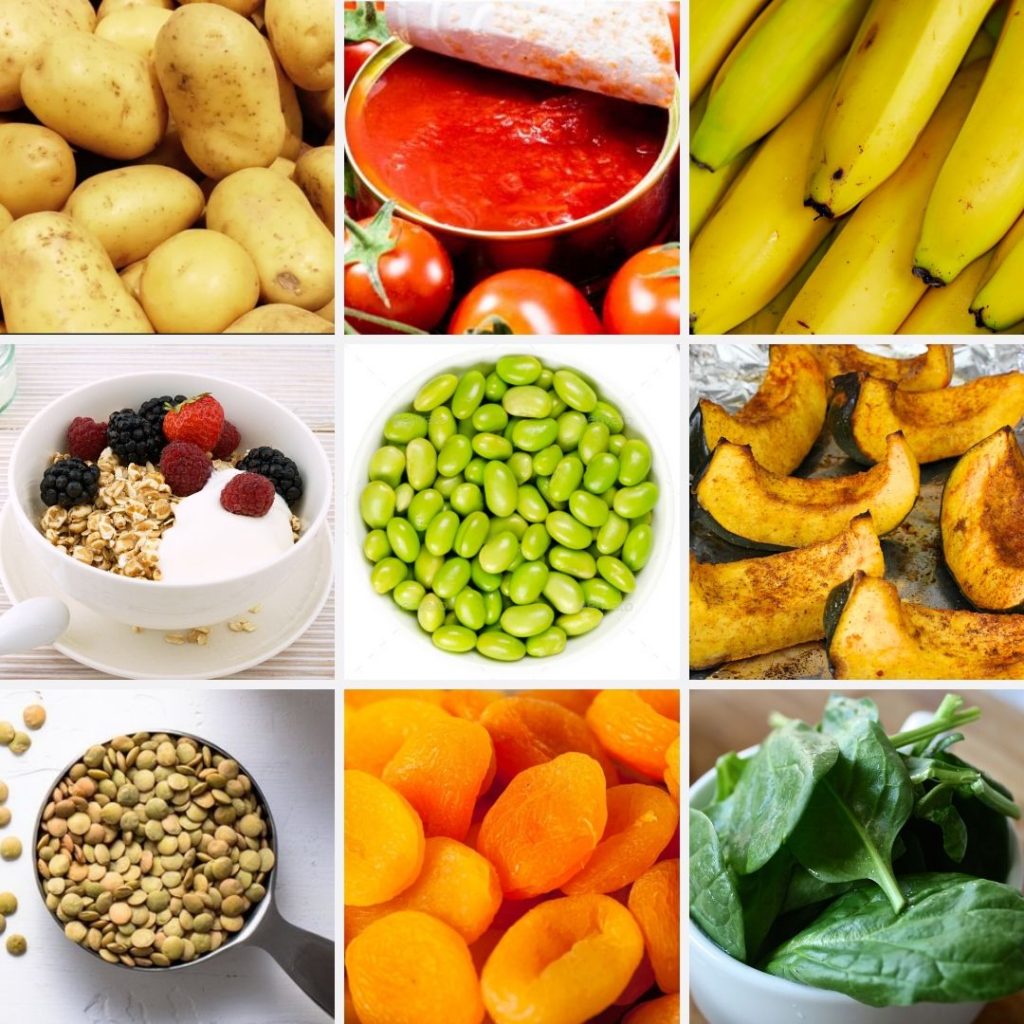 Banana potasyum baxımından ən məşhur qidalardan biridir. Bununla yanaşı, kartof, ispanaq, pomidor, avokado və quru meyvələr də bu mineralın yaxşı mənbələridir. Süd məhsulları və balıq da potasyum ehtiva edir.