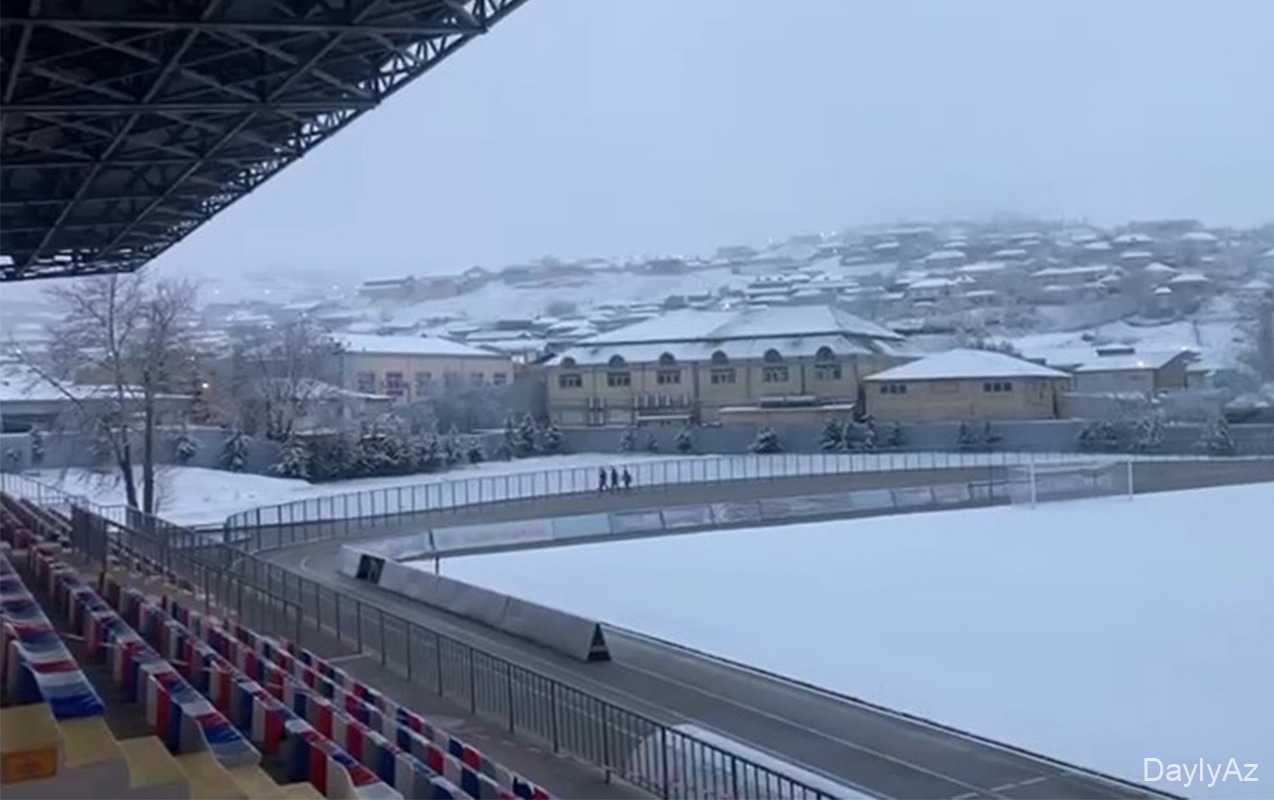 “Qafqazinfo” xəbər verir ki, matçın keçiriləcəyi Şamaxı Şəhər Stadionunun ot örtüyü qarla örtülüb.